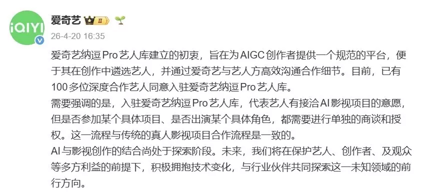 并强调入驻爱奇艺纳逗Pro艺人库,代表艺人有接洽AI影视项目的意愿,但是否参加某个具体项目、是否出演某个具体角色,都需要进行单独的商谈和授权。这一流程与传统的真人影视项目合作流程是一致的。