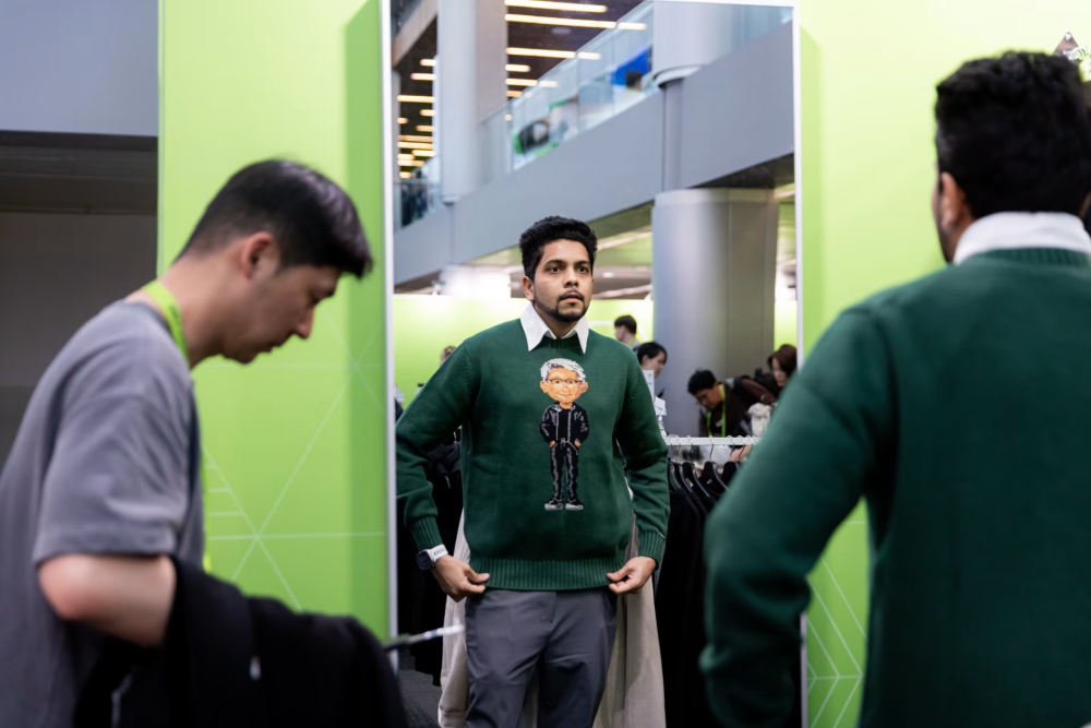 英伟达年度大会期间,哈迪克·纳哈塔在纪念品店试穿了一件有黄仁勋卡通形象的毛衣