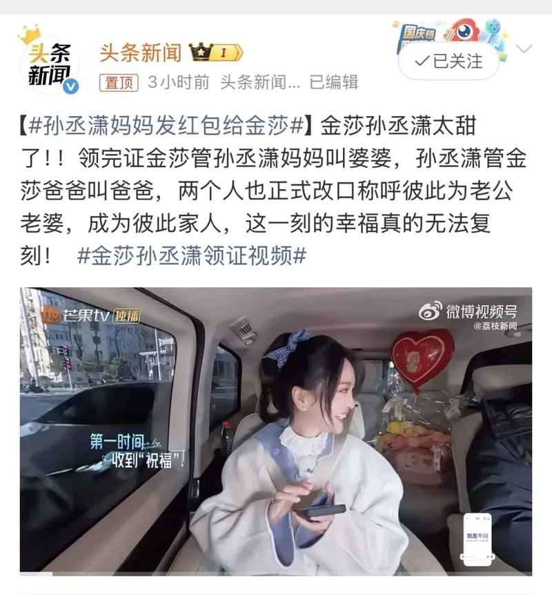 这段姐弟恋已经4年了,期间惹出不少话题,能最终走到结婚这一步,很多人没想到。于是#金莎孙丞潇领证 词条瞬间冲到热搜第一,微博阅读量破了1.7亿,全网加起来有十几亿。