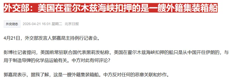 美伊停火协议到期前夜,美国人又动手了!美军驱逐舰,在阿曼湾扣押了伊朗货轮。这船,是伊朗的,但它被美军扣押后,西方媒体却刻意放大了另一个标签“从中国驶来”,这是想干嘛?面对这赤裸裸的“碰瓷”,中国是怎么回应的?