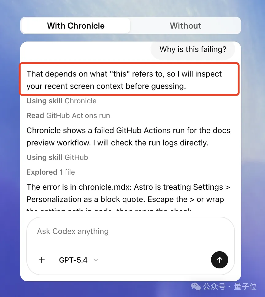 OpenAI自己是这么描述Chronicle的,它能让Codex听懂你说的「这个」和「那个」。