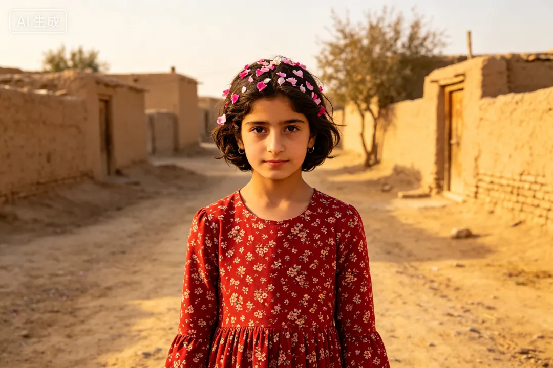 风吹过土墙,扬起细沙。她的裙子是褪了色的花布,脚上是一双破旧的塑料凉鞋。