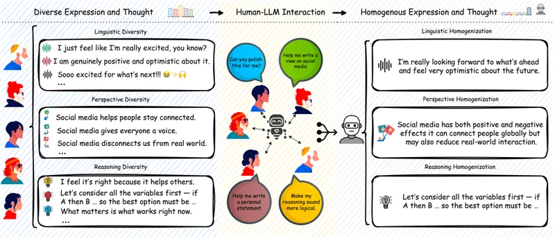 人们多样化的表达,在经过AI润色后,失去了多样性。图片来源:Trends in Cognitive Sciences, Sourati et al., “The homogenizing effect of large language models on human expression and thought” https://www.cell.com/trends/cognitive-sciences/fulltext/S1364-6613(26)00003-3
