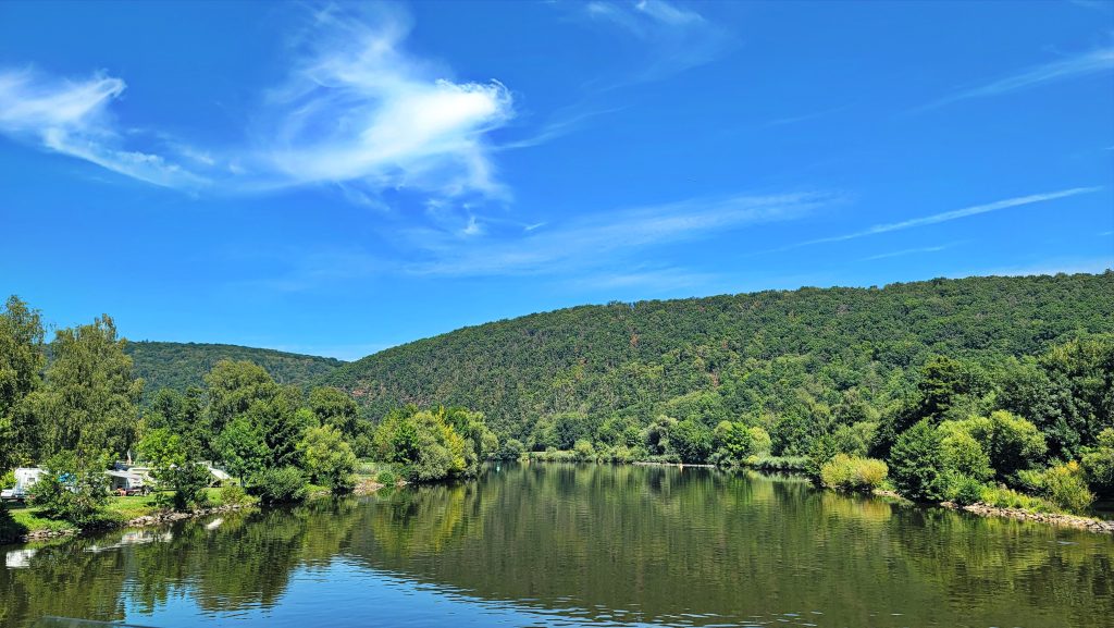 此时的美因河水平缓而深远,仿佛一条流动的历史长卷,将沿岸的风景与记忆一一展开。两岸是典型的德意志乡村图景:半木结构的古老房屋依河而建,红瓦屋顶在阳光下闪着温暖的光;远处是起伏的农田与连绵的施佩萨尔特 (Spessart) 林地森林,绿意层层,静谧而深邃。