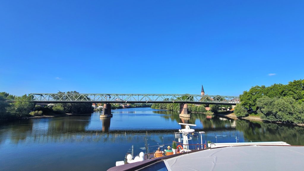 河轮即将驶过横跨美因河的科斯特海姆大桥(Mainbrücke Mainz-Kostheim),大桥一端通往威斯巴登,另一端连接美因茨市区。