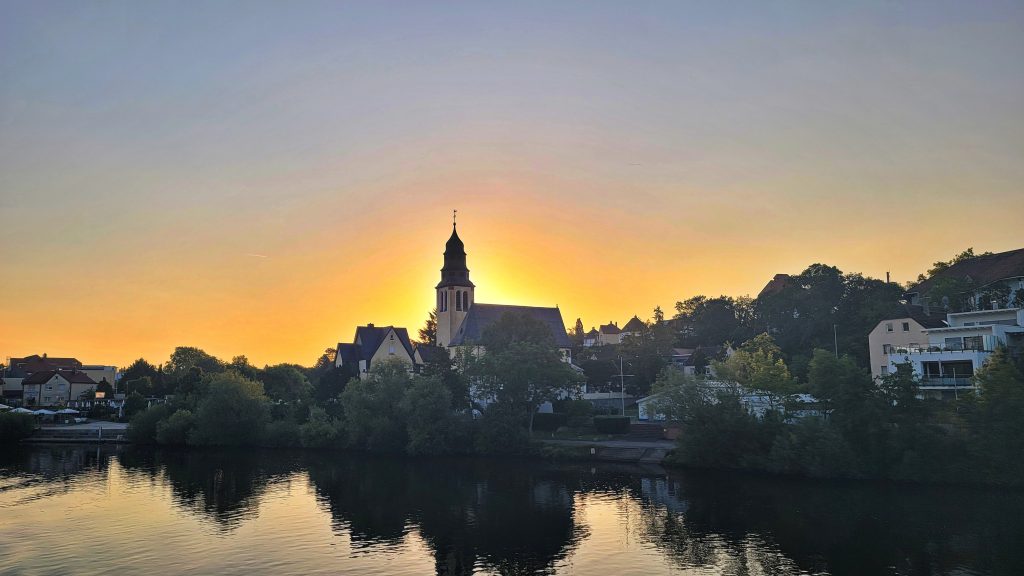 当我们在翌日的晨曦中醒来,河轮已驶过法兰克福莱茵-美因地区的凯尔斯特巴赫小镇(Kelsterbach),中心显眼的教堂是圣心教堂(Herz-Jesu-Kirche)。