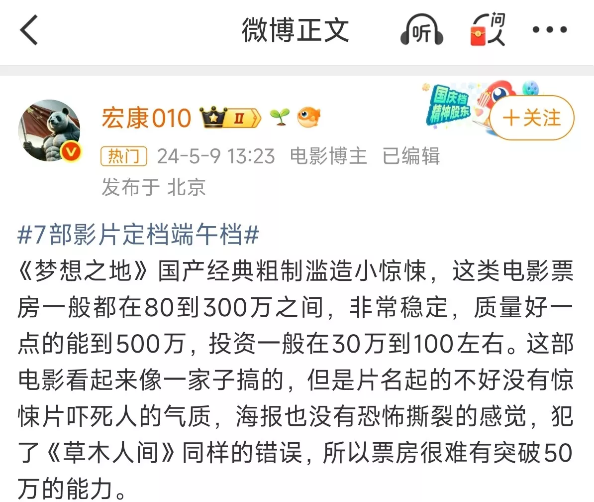 曾有微博电影板块的KOL指出,《梦想之地》是国产经典粗制滥造惊悚片。(微博@宏康010)