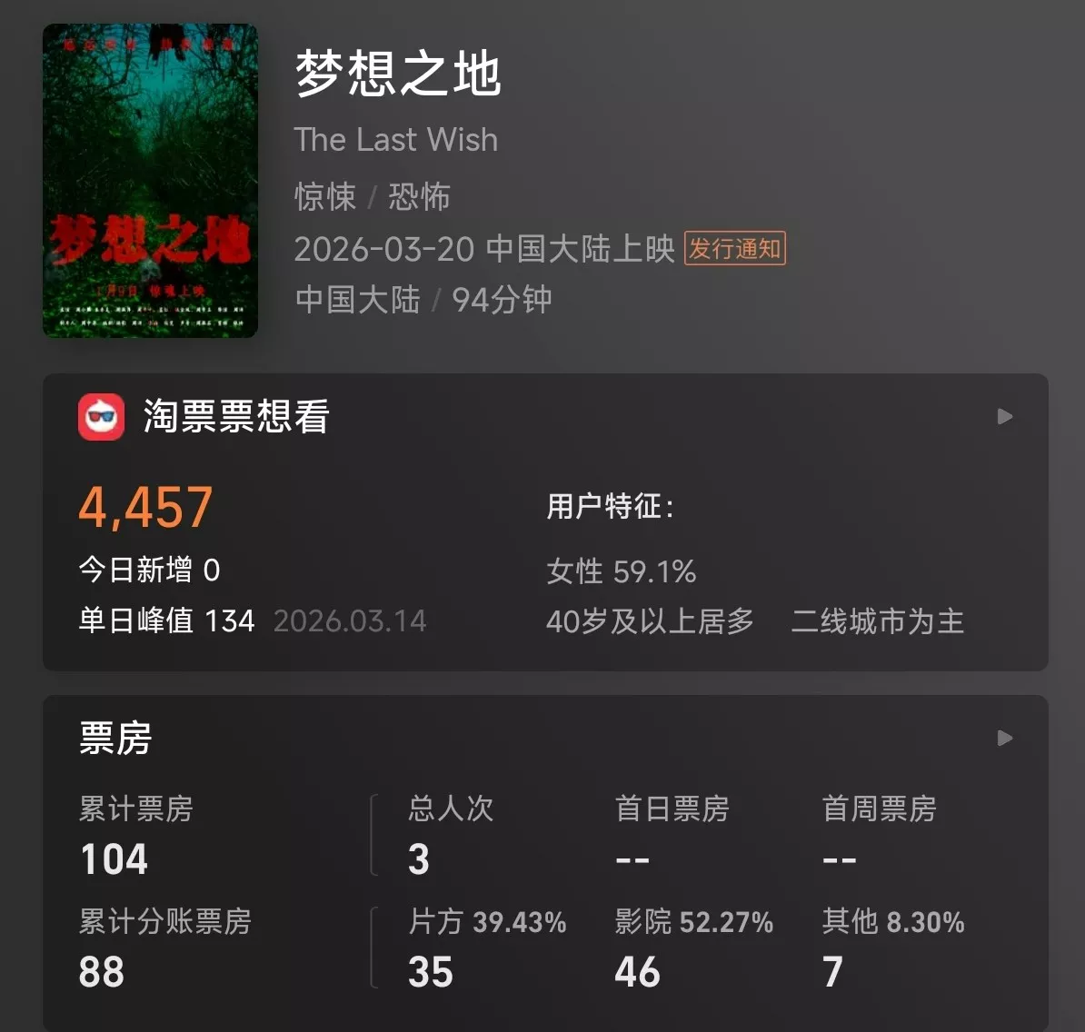 但在现实中,该电影各项数据先让人感到“恐怖”。猫眼专业版、灯塔以及淘票票等内地电影票务平台的数据显示,《梦想之地》在2025年6月上映,随后疑似因票房惨淡而遭遇撤档,并于2026年3月20日重映。截至4月16日,该电影仅卖出3张电影票,总票房定格在104元,片方最终分账到手仅35元。