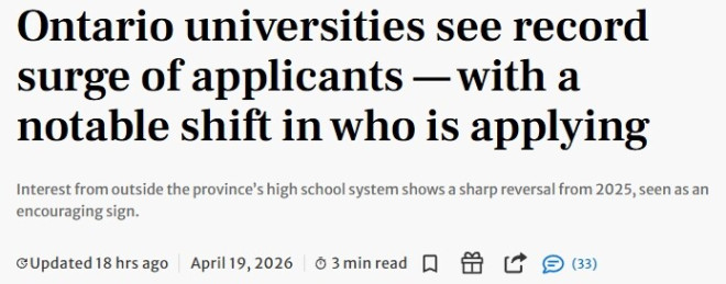 2026 年秋季,安省大学迎来了过去 50 年来最多的申请:16.8 万人投出近 81 万份申请。其中最令人惊讶的是,国际学生的申请热情出现了戏剧性反弹:校外申请者(包括留学生、成熟学生和转学生)猛增 12.4%,打破了过去两年连续下滑的魔咒。