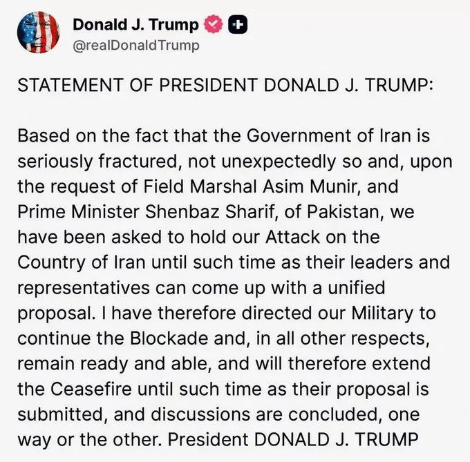 在停火即将到期之际,唐纳德·川普宣布延长对伊朗停火,理由是应巴基斯坦斡旋请求,等待德黑兰提交统一谈判提案。
