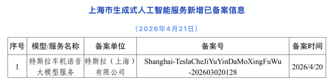 特斯拉车机语音大模型服务完成备案网信上海