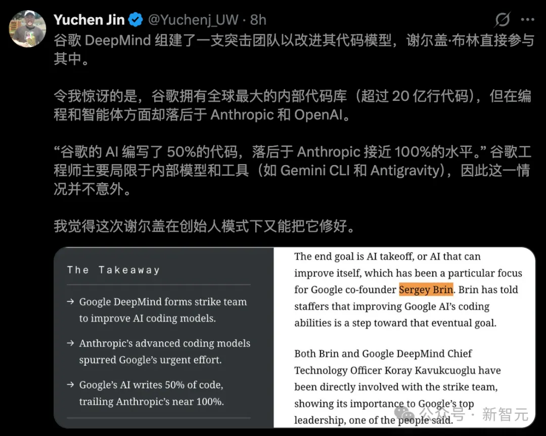 谷歌再次进入「红色警报」状态!联合创始人谢尔盖·布林亲自挂帅,组建秘密攻坚队「追杀」Anthropic。