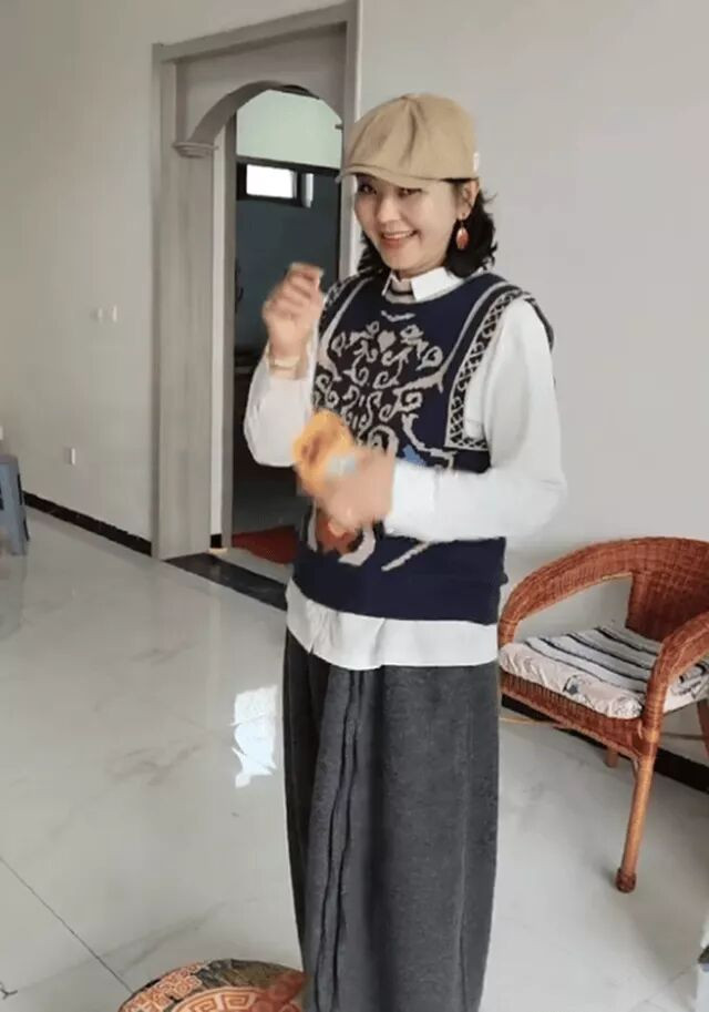 晒出的照片中,方琼穿着一身简单的白衬衫搭配藏蓝色针织马甲,下身套着阔腿裤,头上戴着一顶卡其色的鸭舌帽,一身穿搭可以说是很低调了。不过,作为村里的名人,方琼一现身还是有不少村民围了过来。