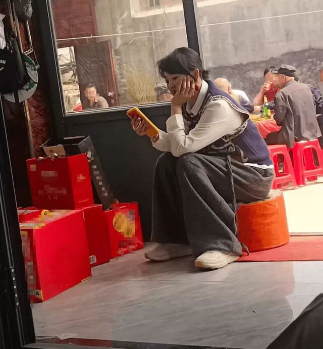 对此一幕,有人打趣说,方琼坐在小板凳上玩手机的样子,像极了过年回家的自己,在一群聊家长里短的亲戚里,找不到话题就只能默默刷手机。