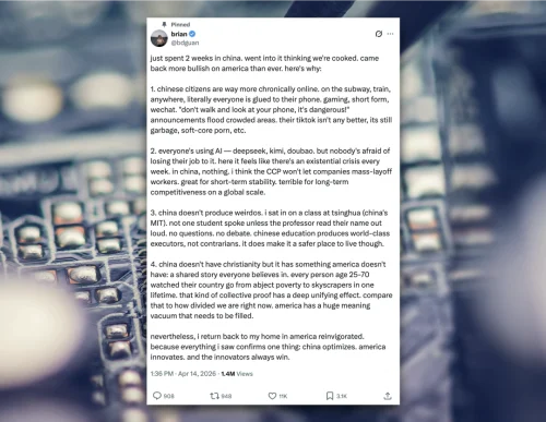 这位名叫Brian的老兄是华裔,父母都是中国人,他带着一种“我们完蛋了”(We're cooked)的焦虑感来到中国,待了两周后,却带着一种极其复杂的“看多美国”的情绪回到了硅谷。
