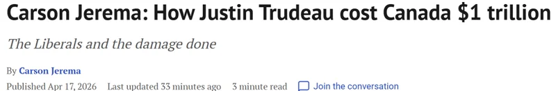 据报道,专栏作家Carson Jerema在其评论文章中直指,特鲁多让加拿大损失了1万亿!