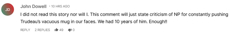 “我没有读这篇报道,也不会去读。这条评论只是表达对《National Post》不断把特鲁多那张空洞的脸推到我们面前的批评。我们已经经历了他10年了,够了!!”