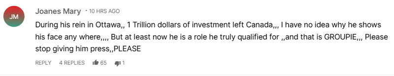 “在他执政渥太华期间,有1万亿加元的投资离开了加拿大……我不知道他为什么还敢在任何地方露面……但至少现在他找到了一个真正适合他的角色,那就是‘追星族’……请不要再给他曝光了,拜托。”