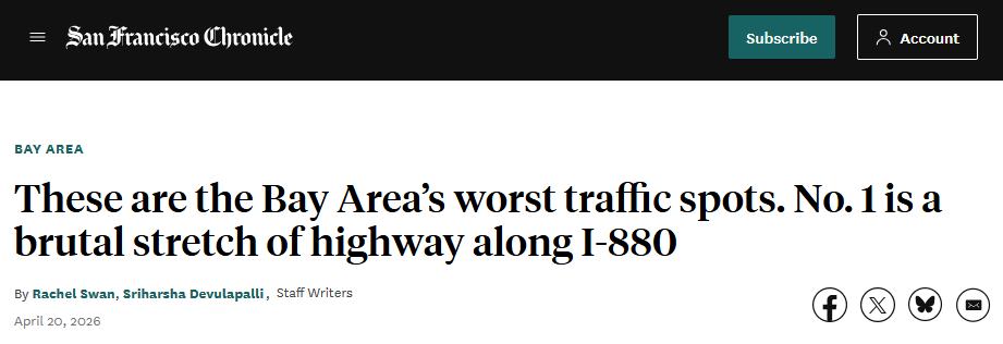 I-880号北向Hayward段连续两年跻身湾区最堵前十路段,主要原因是大量车辆在相近时间涌入,向同一方向行驶。从加州交通局数据中显现的一个主题是硅谷上班族的困境,许多人被要求返岗办公,开车成为唯一可行的选择。2025年第二季度加州交通局评选出的前十最堵路段中,有四处位于圣克拉拉县的高速公路,反映出南向工作通勤的交通轨迹,许多员工来自科技或航空航天企业,前往圣荷西或摩根山(Morgan Hill)的郊区。
