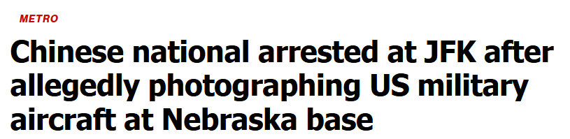 一名中国公民在美国最敏感的军事基地附近拍摄军机后,在试图登上国际航班的最后时刻,在纽约肯尼迪国际机场(JFK)被联邦当局逮捕。