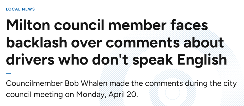 但Whalen并不满意:“遇到一次都嫌多。我们应该在Milton市的交通法规里加进去——你必须能说英语,警察才放你走。不管因为什么原因被拦下,不会说英语,就不能开车。能不能制定一个保护Milton市民、防范不说英语的司机的规定?”