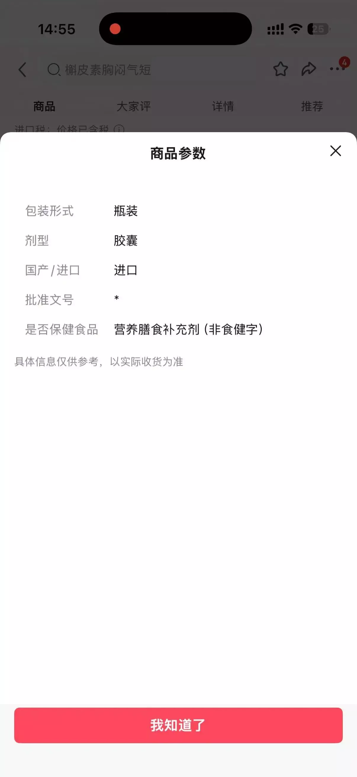 它跟优思益一样,连蓝帽子(保健品批文)都没有,只能算普通食品。点开商品参数就看到:没有批准文号,只是“营养膳食补充剂”,“非食健字”就是普通食品。