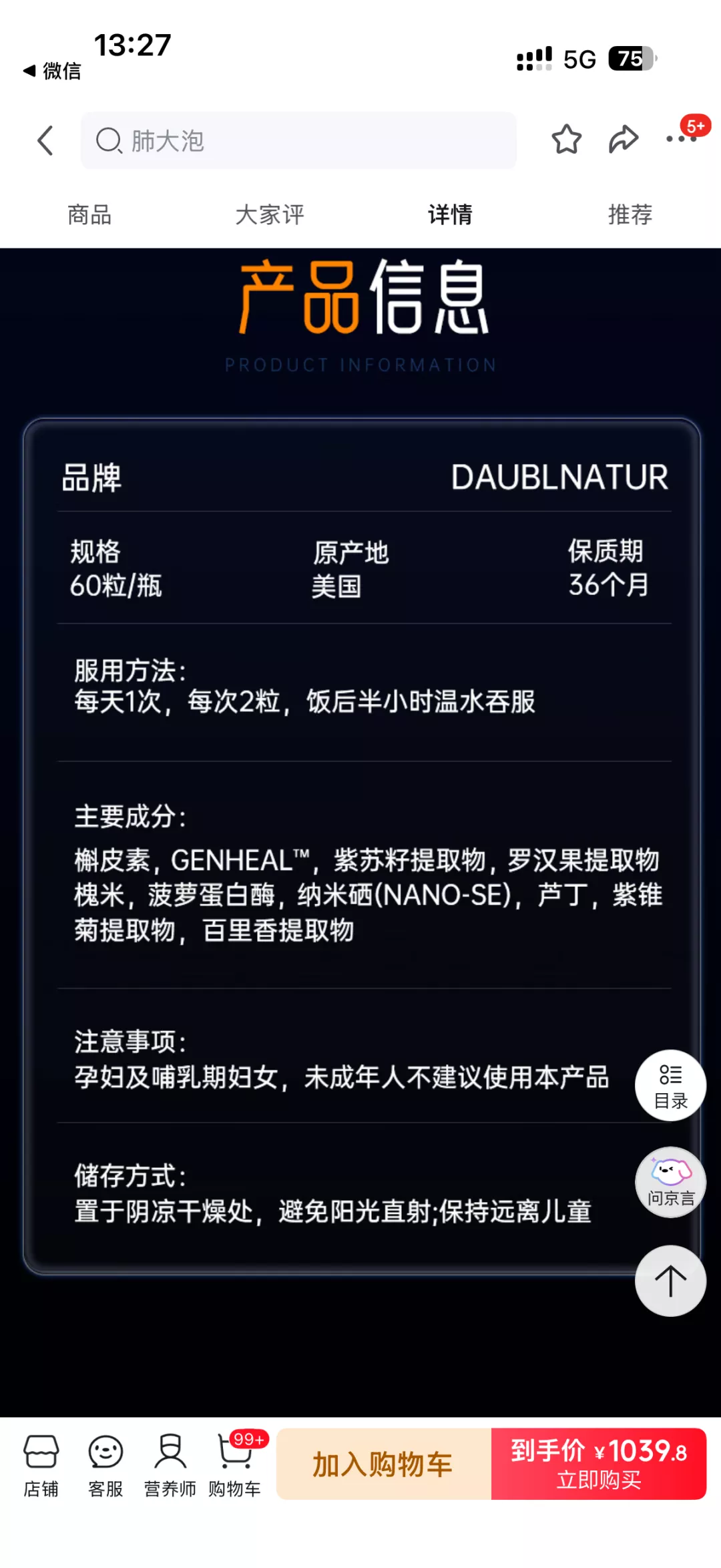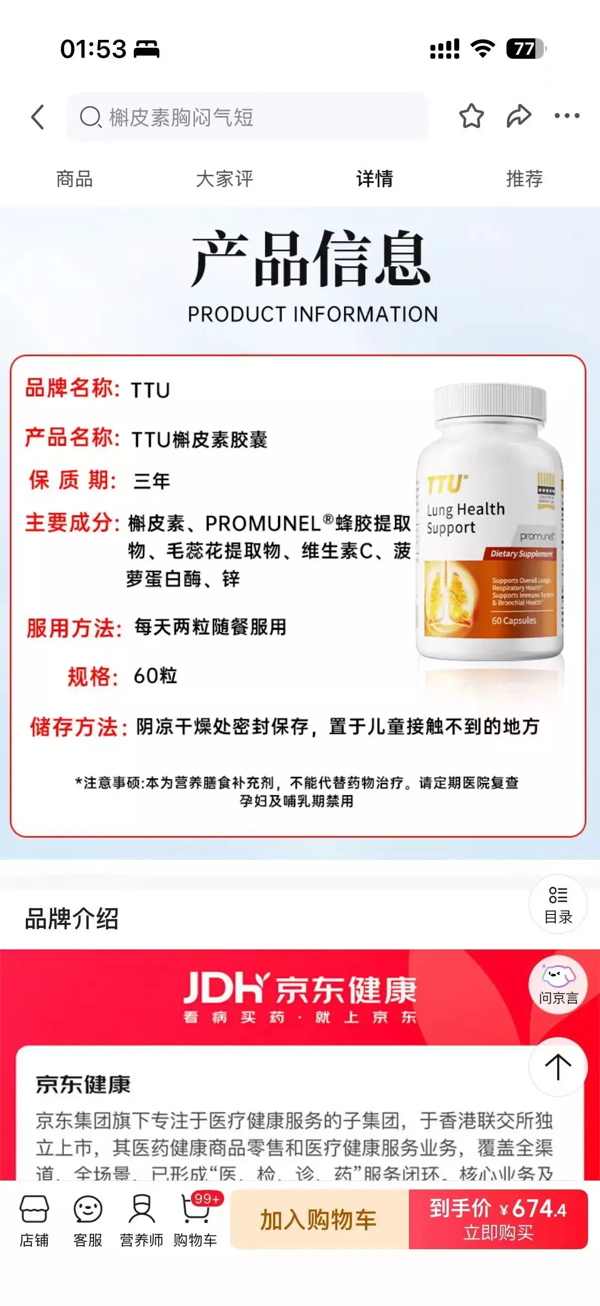 5.同样有京东互联网医院公共营养师团队为该成品背书,声称可以有效改善“肺结节”、“胸闷胸痛”、“肺虚”、“咳嗽”等。