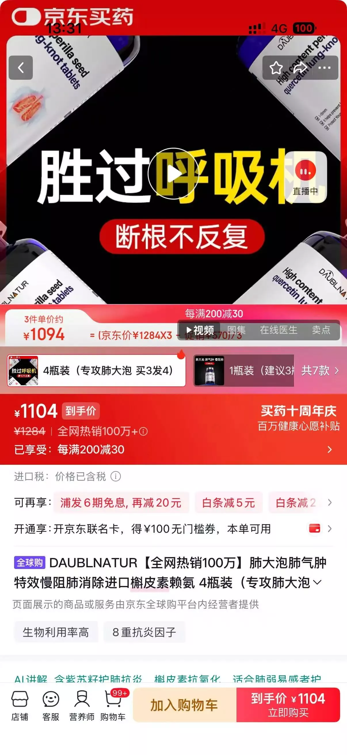 但是,他们没有清理干净,你点视频进去看直播,从25秒开始,开口就是“肺大泡”“尘肺”“慢阻肺”,声称该产品针对这些问题“效果惊人”——所以,你们干活能不能不要这么糙?