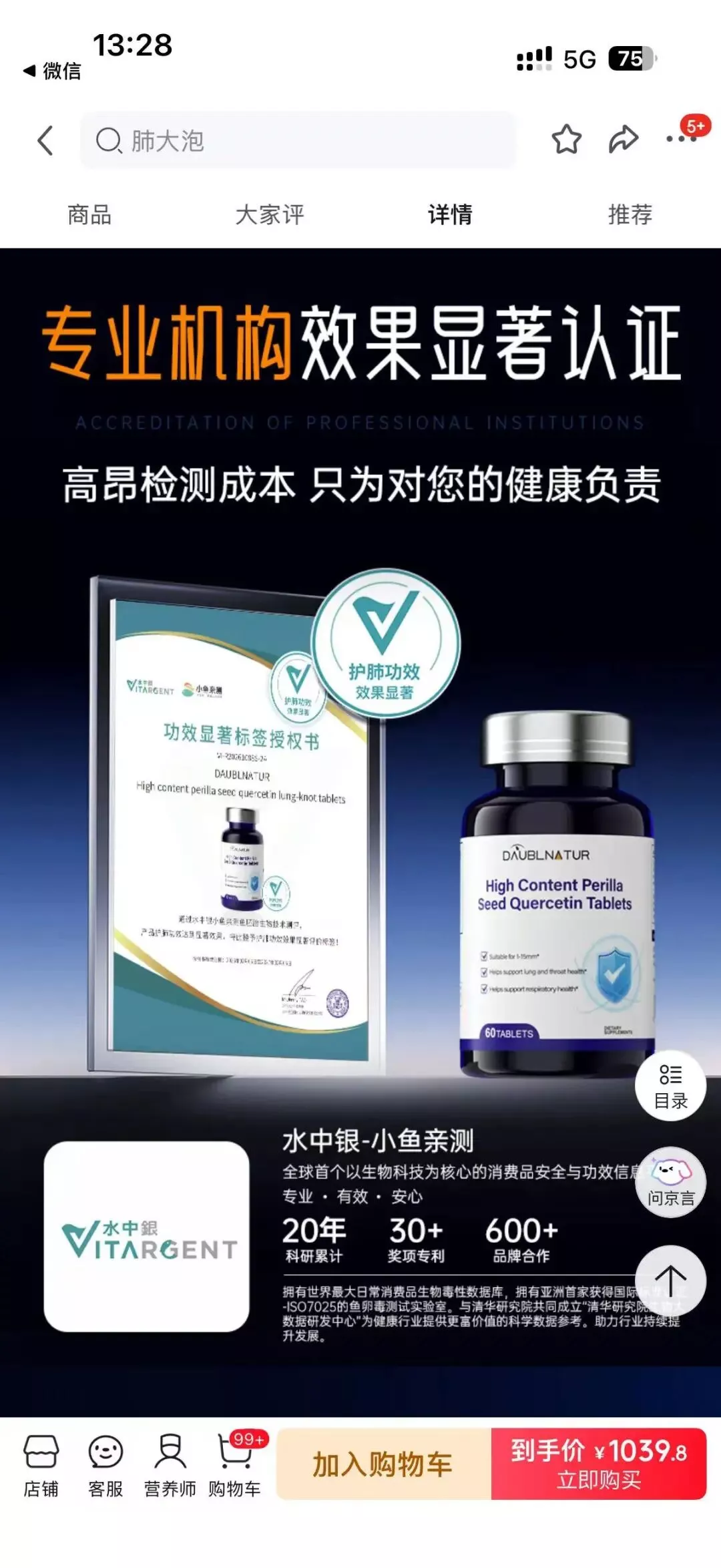 详情页全是那种熟悉的套路:美国进口、槲皮素、植物提取物、专业机构检测和所谓的真实客户反馈等等。