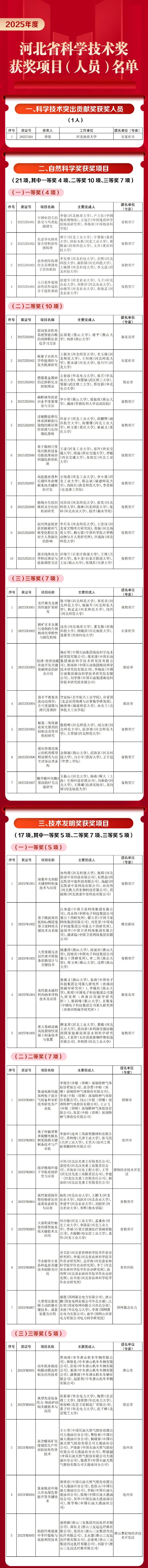 河北省科学技术奖获奖项目名单公布河北省科学技术厅4/22/20264月22日,2025年度河北省科学技术奖励大会在石家庄召开,对促进我省科学技术进步和经济社会发展作出突出贡献的单位和个人颁奖,275项(人)获2025年度河北省科学技术奖。 00