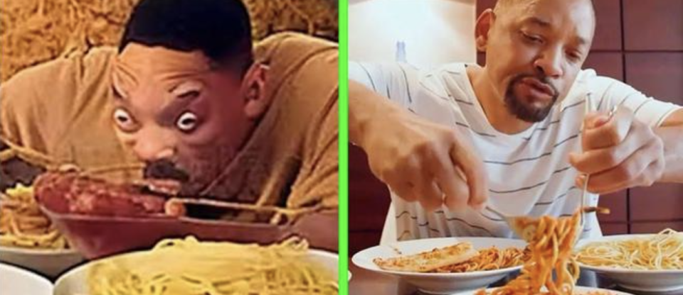 威尔·史密斯吃意大利面的视频,已经成为检测AI生成视频技术能力一项“另类标准”,左右两幅图不过间隔了一年时间,但逼真程度不可同日而语