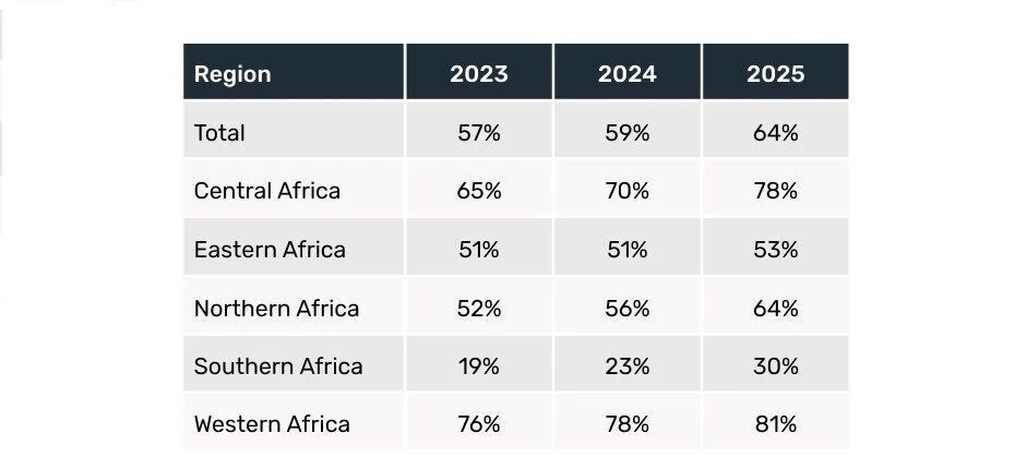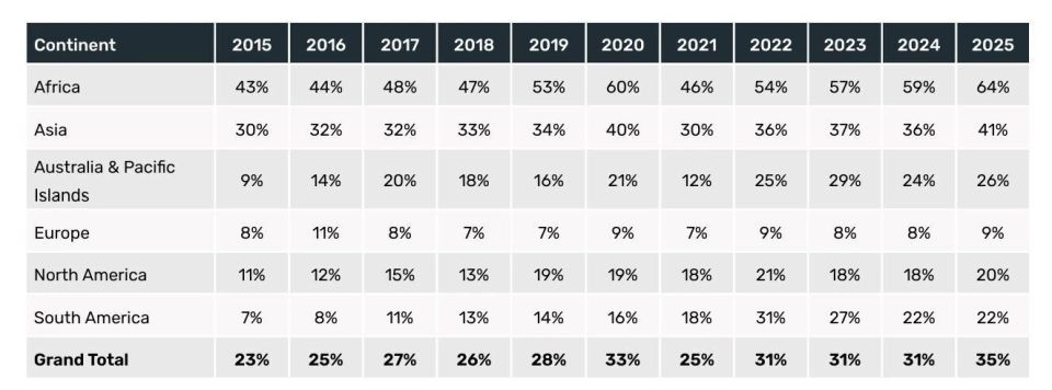 非洲长期全球范围内拒签率最高的地区,从2015年的43%升至2025年的64%。