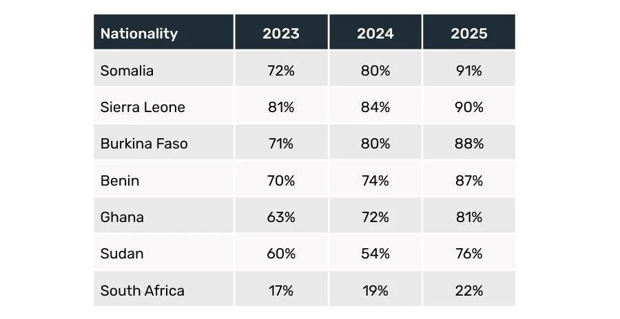 其中西非尤为突出,2025年整体拒签率高达81%,部分国家如索马里(91%)、塞拉利昂(90%)、布基纳法索(88%)、贝宁(87%)等均超过85%。南部非洲虽相对较低(30%),但也在持续上升(2023年为17%)。