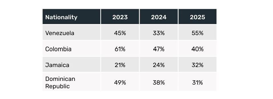 部分国家的拒签率显著下降,例如,哥伦比亚(由2024年的47%降至2025年的40%)和多米尼加共和国(由2024年的38%降至2025年的31%);然而,另一些国家的拒签率却呈上升趋势,例如委内瑞拉(由2024年的33%升至2025年的55%)和牙买加(由2024年的24%升至2025年的32%)。总体而言,该地区的拒签模式似乎因国家而异,差异显著。