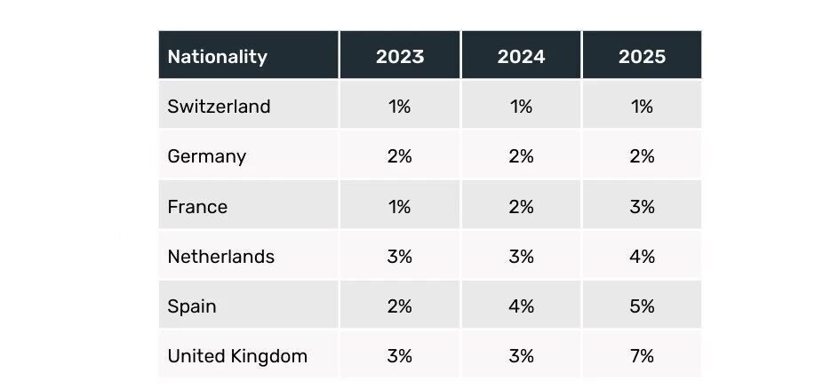 西欧学生的拒签率在全球范围内持续保持着较低水平。在大多数西欧国家,过去十年间拒签率通常处于个位数范围内。德国、法国、荷兰和瑞士等国学生的拒签率相对稳定,且非移民签证获批率历来较高。尽管赴美留学的西欧学生人数相较于亚洲等主要地区而言规模较小,但这些国家签证审批结果的稳定性,在审视全球拒签模式时提供了一个重要的比较基准。