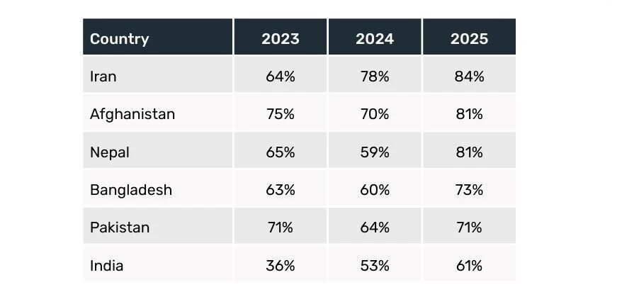 南亚成为近年来拒签率上升最快的区域之一。2025年,尼泊尔(81%)、孟加拉国(73%)、巴基斯坦(71%)和印度(61%)均处于极高水平。尤其是印度,作为美国国际学生最大生源国之一,拒签率从2023年的36%升至2025年的61%,对美高校财政和人才来源构成直接冲击。