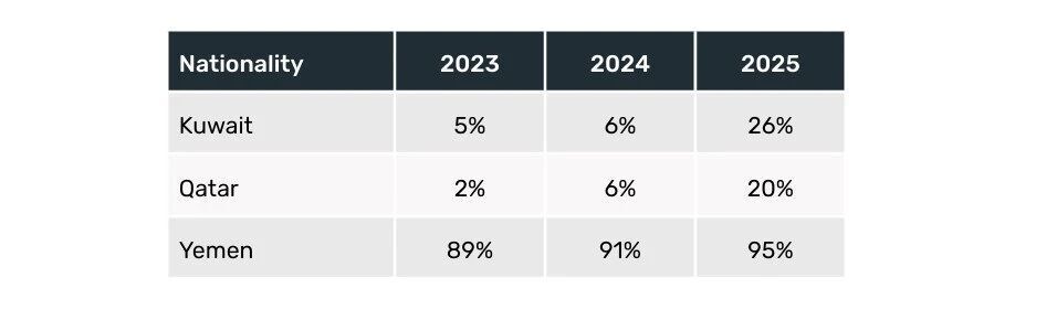 中东地区的拒签结果呈现出日益显著的分化趋势。部分国家经历了拒签率的急剧攀升,其中包括科威特(从2024年的6%升至2025年的26%)和卡塔尔(从2024年的6%升至2025年的20%);而另一些国家----尽管此前已面临极高的拒签率----其拒签水平仍进一步上升,例如也门(从2024年的91%升至2025年的95%)。这些模式表明,该地区各国的签证审批结果正呈现出日益增大的变异性。