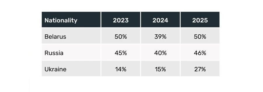 东欧地区也呈现出进一步收紧的迹象。在之前前有所下降之后,包括俄罗斯(从2024年的40%升至2025年的46%)、白俄罗斯(从2024年的39%升至2025年的50%)和乌克兰(从2024年的15%升至2025年的29%)在内的多个国家的拒签率均有所上升。