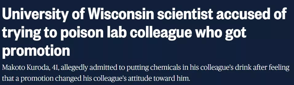 近日,美国威斯康辛大学麦迪逊分校一名41岁的日籍研究员黑田诚(Makoto Kuroda),因涉嫌向共事多年的同事投毒被警方逮捕,目前面临鲁莽危害安全、篡改日用物品两项重罪指控。根据警方公布的刑事起诉书,黑田因长期不满同事的工作表现与升职,向对方的饮用水瓶、工作鞋投放实验室常用有毒化学品,甚至专门通过ChatGPT查询化学品对人体的有害剂量。