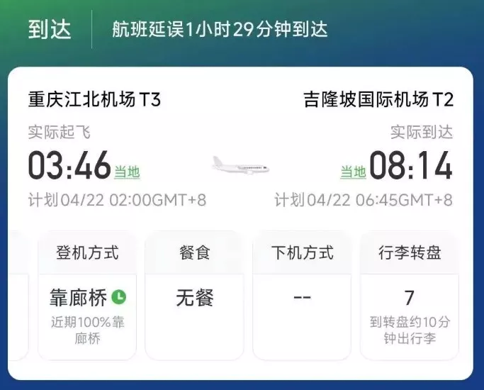 据了解,涉事航班为马来西亚亚洲航空公司D7809,原计划22日凌晨2点起飞,当地时间6点45分抵达目的地。但因为这场争执,航班实际起飞时间为3点46分,延误1小时46分。实际抵达时间8点14分,延误1小时29分。