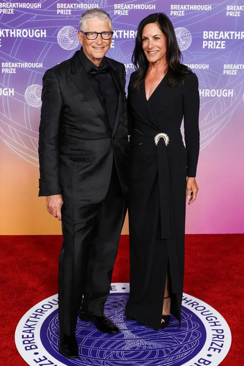 比尔·盖茨也带着女友葆拉亮相,穿一身黑耍酷,上衣还选了束腰的款式,就是这啤酒肚怎么都遮不住。