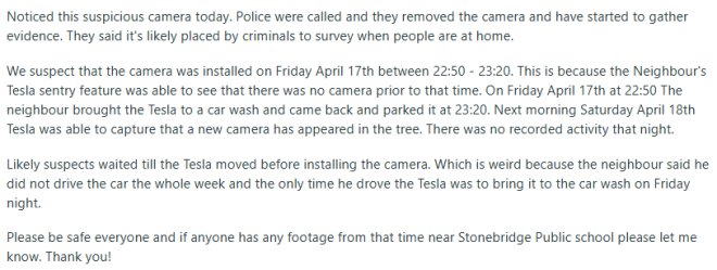 该居民表示:“我们推测该摄像头是在4月17日(周五)晚上22:50至23:20之间安装的。因为邻居的特斯拉哨兵模式(Sentry Mode)记录显示,在此之前树上并没有摄像头。”