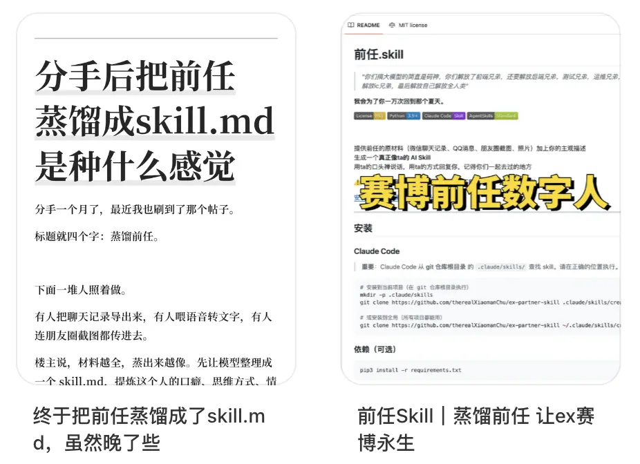 要想把蒸馏前任讲清楚,就不得不提有位程序员上线了一个名为“colleague(同事).skill”的项目。他把飞书消息、钉钉文档、工作邮件等职场数据作为素材喂给AI,直接炼化出一个24小时在线、永不疲惫的数字同事。