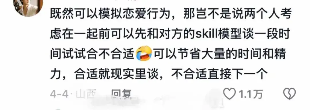 既然skill能够模拟恋爱行为,那我们大可以先跟对方的AI模型相处一段时间,如果聊得来,再在现实里接触。