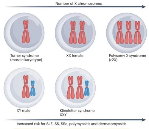 尽管性激素起到了重要作用,但它并不能完全解释自身免疫病的性别偏倚。部分自身免疫病(例如SLE和多发性硬化症)也能发生于青春期前的女童,此时患者体内的性激素轴尚未完全建立,雌激素和孕激素水平仍较低。这意味着还有其他因素参与自身免疫病的发病,而且这种差异在生命的早期阶段便已存在。于是,研究人员把目光转向了两性间最本质的差异:性染色体。