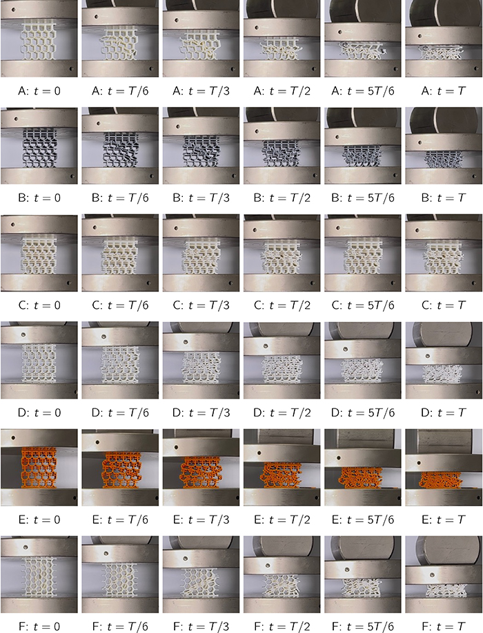 研究团队通过增材制造(3D 打印)技术,将这些字形的对称单元制作成阵列超材料,并通过施加重载压缩,以经典的六边形蜂窝结构作为参照,系统测试其力学性能。