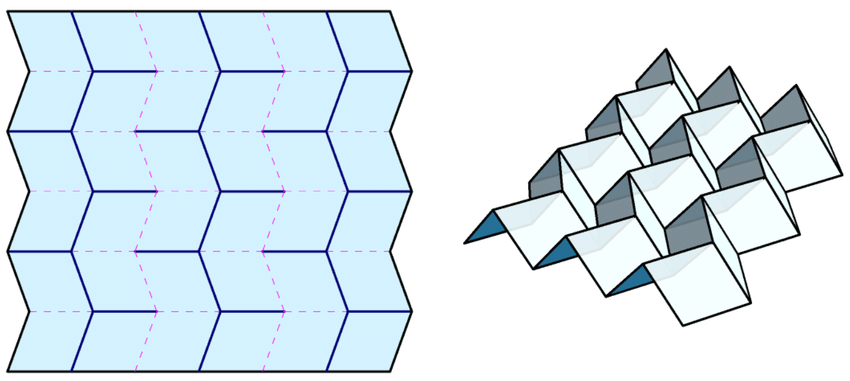 在这项爱丁堡大学的最新研究之前,从人类文化遗产中提取结构灵感的尝试已有先例。折纸艺术就是其中最广为人知的例子。日本折纸的几何折叠原理,尤其是“三浦折叠”(Miura-ori),因其特殊的机械双稳态效应,已被广泛应用于可重构超材料的设计,出现在航天展开结构、柔性电子器件以及软体机器人等场景中。