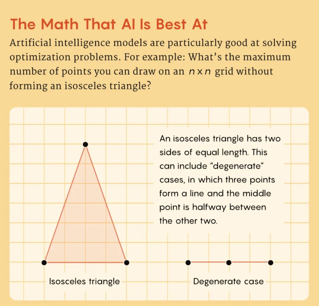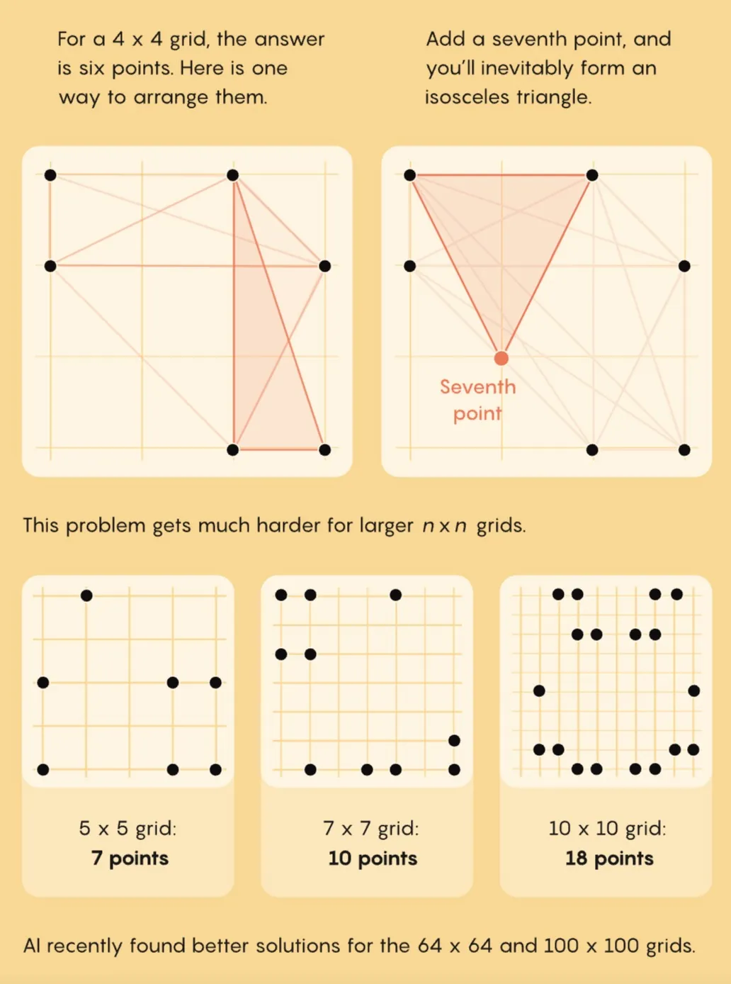 但在最初几年,这只是一个冷门领域。起初,Charton 和其他少数人使用 AI 解决已知答案的问题,只是为了看看新技术能否奏效。到 2024 年,他们开始取得进展。他们寻找有丰富数据可供分析的问题,然后用 AI 构建具有可量化属性的数学对象 —— 例如在网格上放置点以避免形成等腰三角形的最佳排列方式。