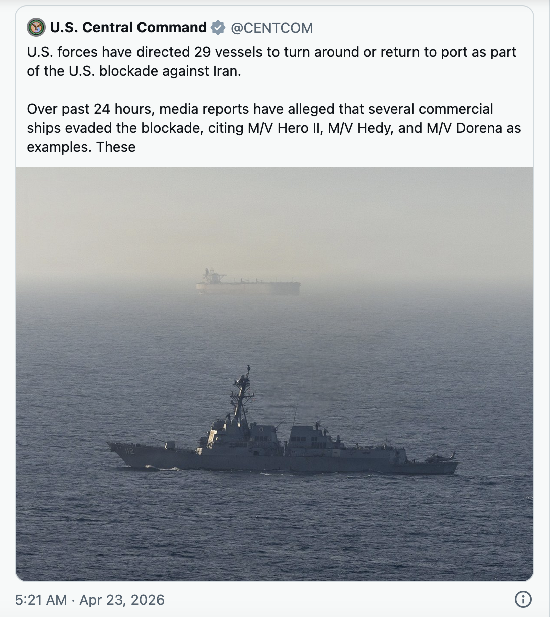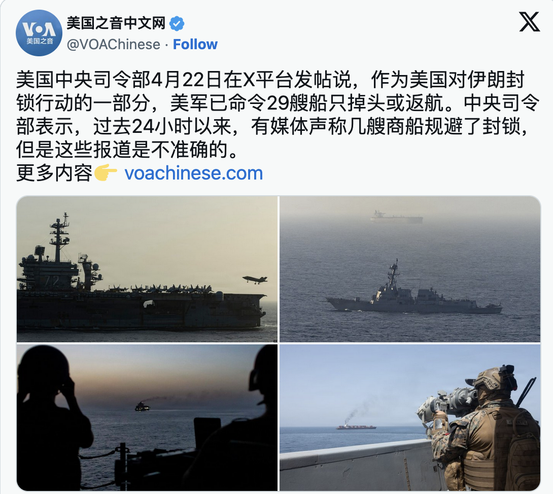 美国中央司令部(CENTCOM)表示,截至星期三(4月22日),在对伊朗港口和石油码头实施封锁进入第10天之际,美军已指令29艘船只掉头或返回港口。与此同时,英国正主办一场聚焦霍尔木兹海峡海上运输安全的会议。