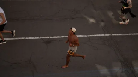 起初,围观的群众还没反应过来,但随着赛程过半,人群中开始爆发出一阵阵惊呼:“看!那个人竟然没穿鞋!”